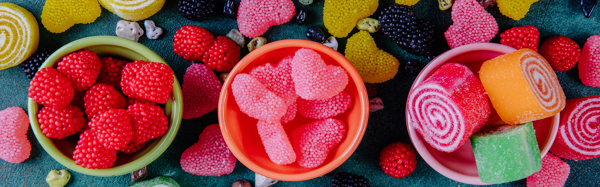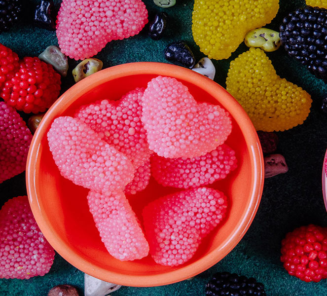 Vă punem la dispoziție o selecție largă de jeleuri delicioase, cu o amplă varietate de forme și arome, de la clasicele Gummy Bears și Gummy Cola Bottles, la cele în formă de fructe: Gummy Cherries, Pineapple Gummies, Tagada Strawberry, Gummies, Watwrmelon sugared slices, Wild redberries, Banana gummies, Gummy sugared green apples, Sugared peaches, dar și ineditele Gummy Ice cream, Sugar-coated Dummies candies, The Smurfs Gummy Fruit Mix, Gummy Pizza Slices, Hearts color sugared, Gummy Dentures Vampire, Gummy Bones red & white, Gummy Carrots, Unicorns, Gummy Fried Eggs, Pink Gummy Kisses, Gummy Bleeding Eyes, Filled Skulls, Confetti dragées Sea Dark Chocolate sau Confetti dragées Summer Dark Chocolate.